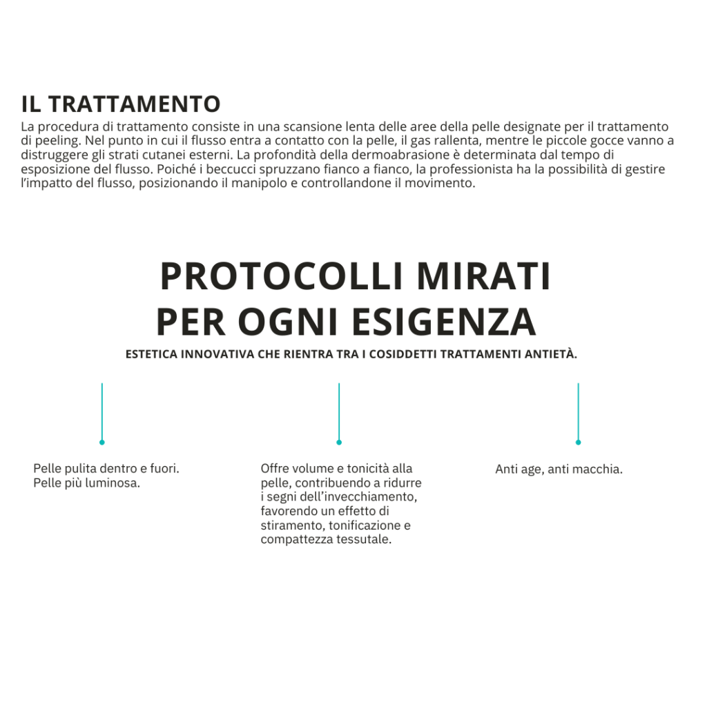 La procedura consiste in una scansione lenta delle aree della pelle designate per il trattamento di peeling. Nel punto in cui il flusso entra a contatto con la pelle, il gas rallenta, mentre le piccole gocce vanno a distruggere gli strati cutanei esterni. La profondità della dermoabrasione è determinata dal tempo di esposizione del flusso.